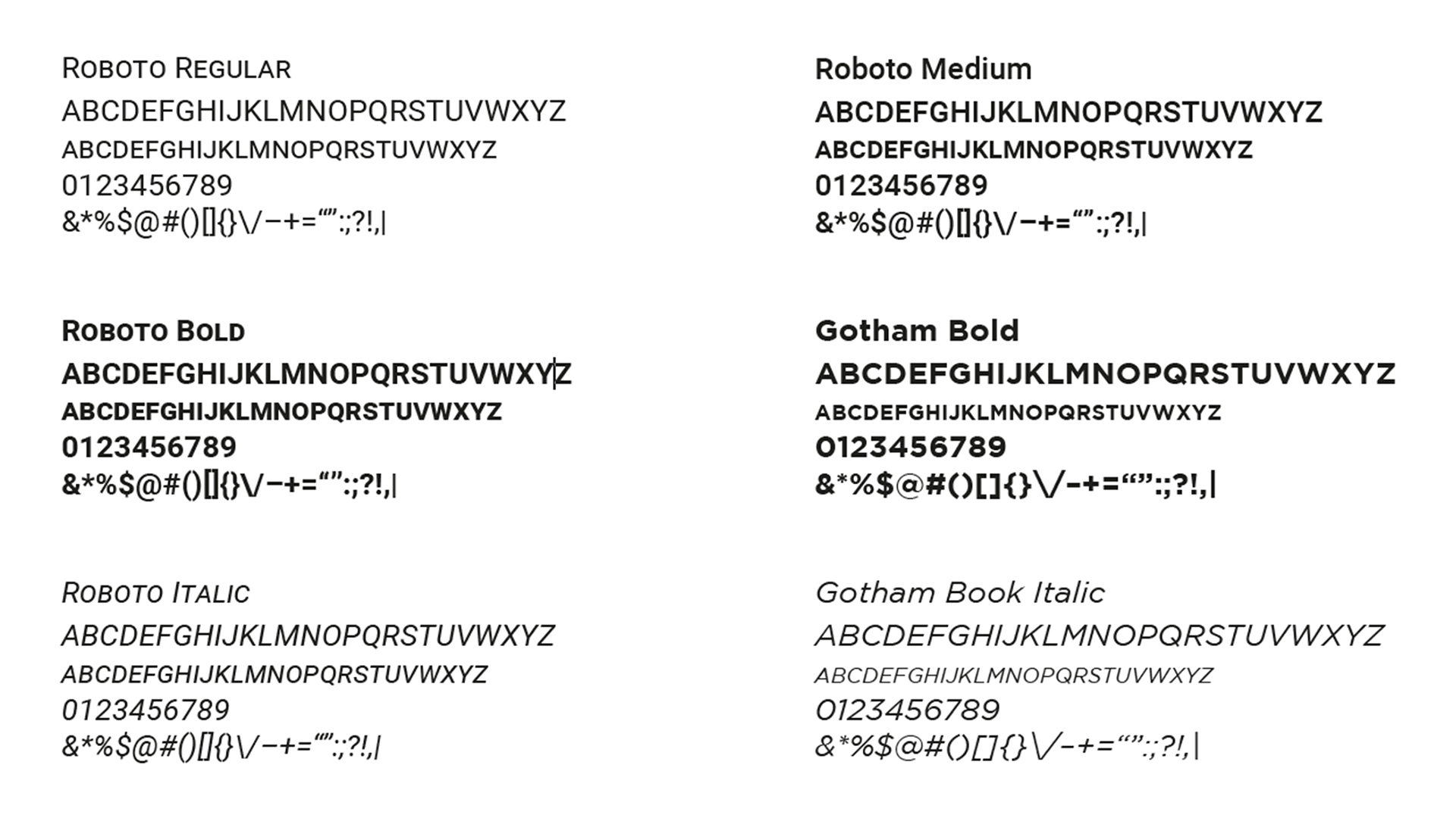 A Roboto Bold será usada nas entrelinhas já que seu peso visual chama mais atenção. E em nomes próprios, citações e entre outros casos que se usa o itálico. Por fim Roboto Medium, um meio termo entre título e texto com a mesma "altura de x", será usada nas legendas e Roboto Light usada nos créditos ao escritor, olho e entre linha de seções e matérias.