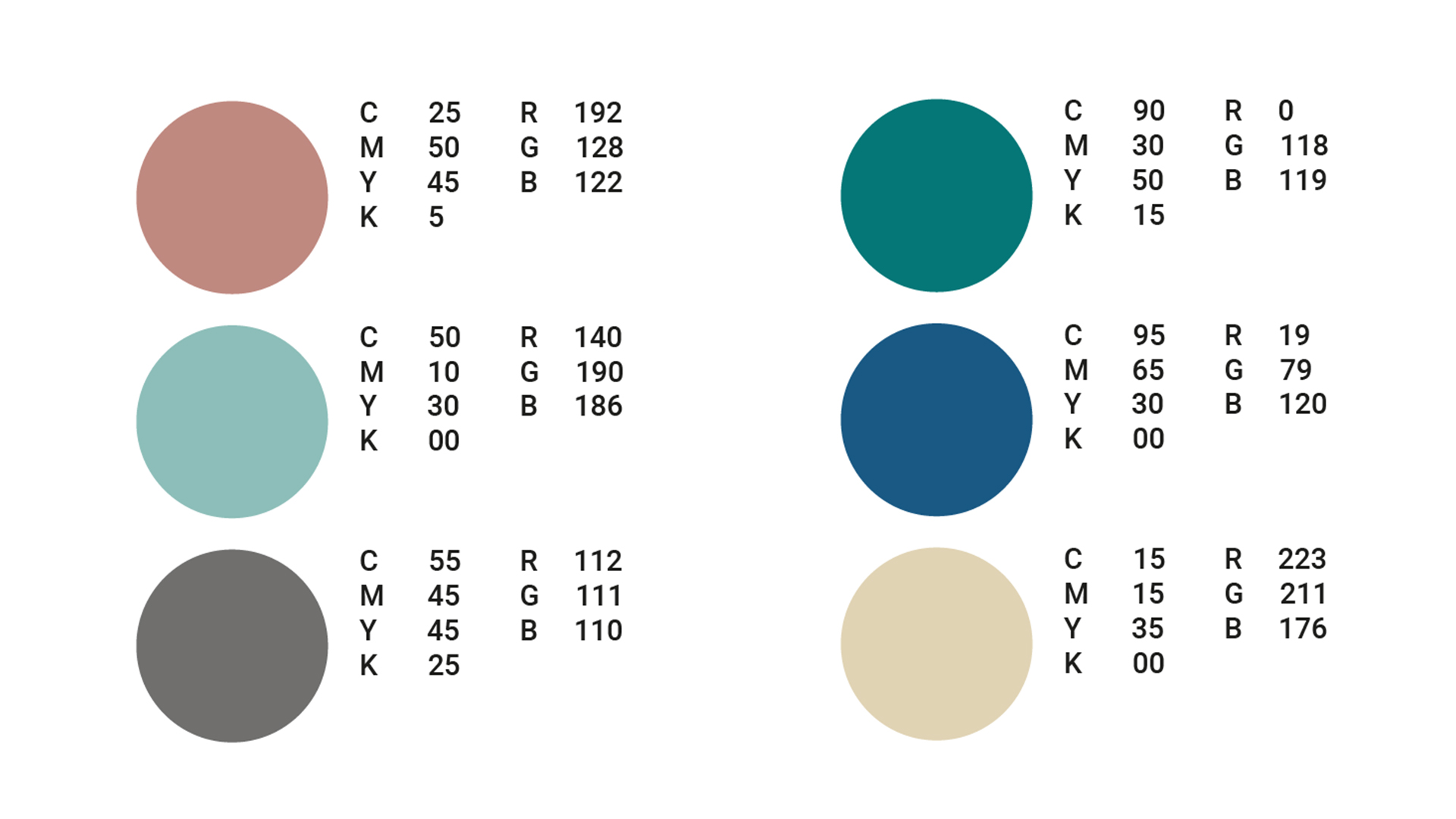 A paleta de cores é composta por seis cores pastéis, com pouco brilho, variando entre claras e escuras, gerando um contraste entre si. O preto é uma sétima cor, que será usada em títulos, entre títulos, linhas finas, créditos, em todo o texto corrido e nos olhos.